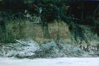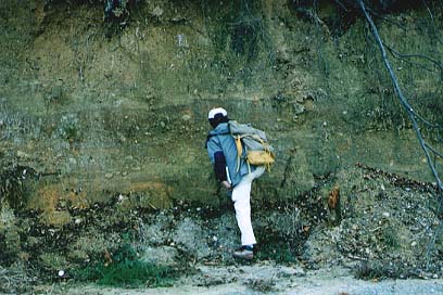 泥の層の中には、マツカサ化石などが見られる。