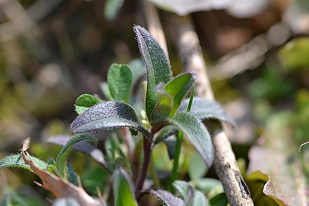 これが農村などに残っている在来種のミミナグサです。だんだんと見る機会が減ってきました。特に早春は茎だけでなく、葉も濃い紫色を帯びているようです。