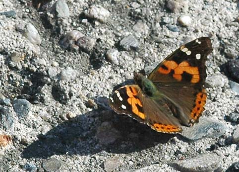 チョウのなかまには成虫で越冬するものも多く見られます。このアカタテハも成虫越冬です。成虫越冬するチョウは暖かい日にはこのように飛び出してきます。日向ぼっこをするところを私に邪魔されてすぐに飛んで行ってしまいました。
