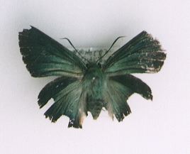 これまでに北摂地域では1度しかアオバセセリを見たことがありませんでした。下は池田市のチョウの記録のページで紹介している、当時の内容です。 1998年8月11日(曇りのち晴れ)午後0字10分、池田小学校での夏休みのプール指導の午前の部が終わって職員室にもどろうと運動場を歩いている時に、子ども達が「ガが死んでいる。」と言って、数人が足でつっついていました。まだ、生展翅ができる遺体でした。 |