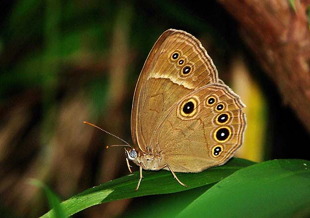 雑木林の生き物の観察をしているとクロヒカゲモドキが飛んできて、目の前の葉に止まりました。
