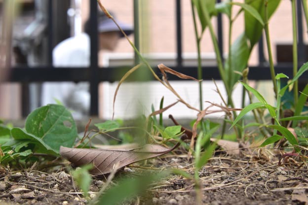 15日、マテバシイの木の周囲にまるくなった枯葉がないか探しました。