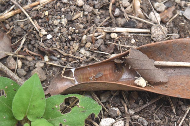 下に丸くなって、周囲にアリが土を運んでいる枯葉が1枚ありました。ムラサキツバメの前蛹になる前の終齢幼虫が入っているに違いありません。枯葉を裏返すと、…いました。ムラサキツバメの終齢幼虫です。糸で枯葉をまるくして蛹になる場所にしていました。下の写真です。そばにいたのは、トビイロシワアリでした。