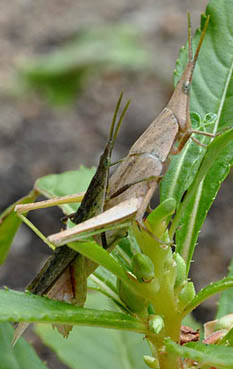 左の写真は、オンブバッタの交尾です。右はトノサマバッタです。