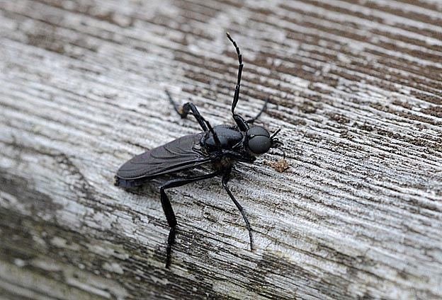 ハグロケバエのメスが止まっていました。オスよりもずっと小さな複眼をしています。