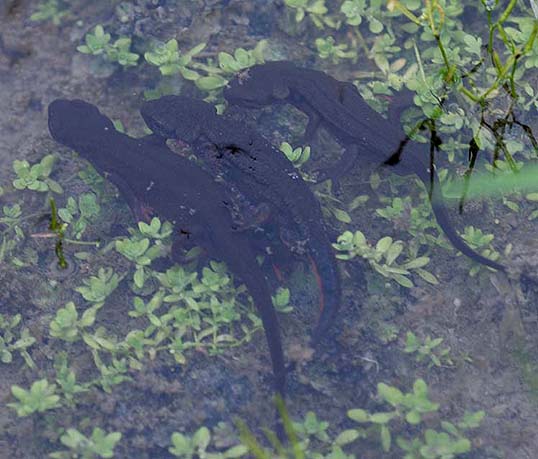 すんでいる場所が分かっているとそこで採集ができるのですがどこにでもいるというわけではありません。天気のいい日は、水中の日陰になった場所にいるので気づかないことも多いようです。イモリに出会うコツは、いそうな場所にめぼしをつけておいて、「5月上旬の雨の日」に探すことです。下の写真のような光景を見ることができます。
