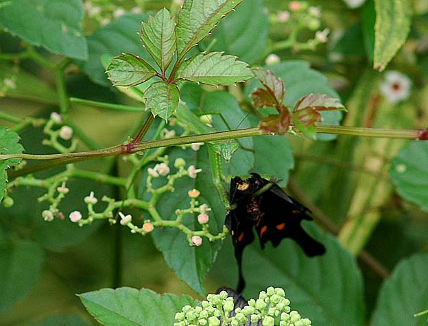 大きなカマキリがジャコウアゲハを食べていました。ここは住宅や自動車道に囲まれた畑の横の小さな草原です。この場所でオオカマキリを見たことがありません。チョウセンカマキリのようです。ジャコウアゲハは体に毒をためているはずなので鳥にはめったに食べられないようです。しかし、チョウセンカマキリなどの昆虫には関係がないようです。 |