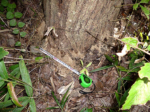 2012年9月24日、大阪府池田市五月山の被害のようすを見てきました。上の写真です。テープの巻かれているのが被害木で、被害木はコナラとアベマキでした。2012年10月1日発行の「広報いけだ第1103号」には「五月山にナラ枯れ被害」と題して五月山のコナラ・アラカシ・アベマキ・シラカシ・スダジイ・クリなどに発生しているとありました。28ページには見つけたときの連絡先も書いてありました。 |