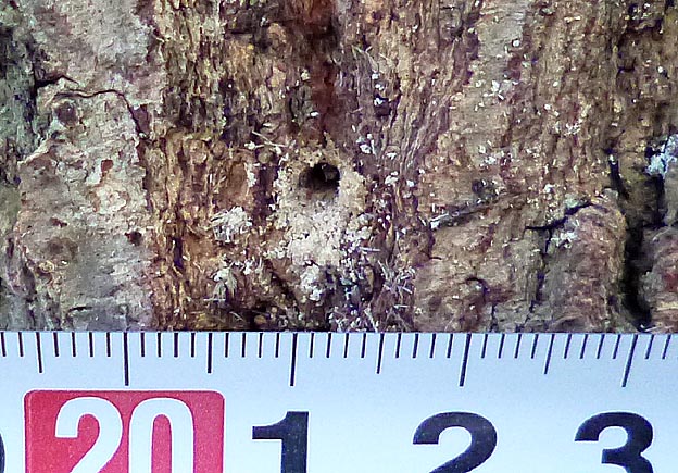 カシノナガキクイムシの食痕です。向きによりオスの開けた穴、メスの開けた穴、幼虫が開けた穴がわかるそうです。 |
