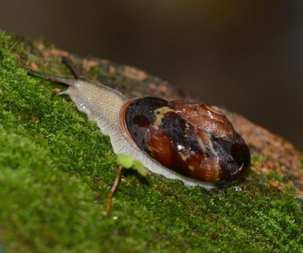 下の写真は、山の中を歩いているヤマタニシです。目がつのの付け根付近にあることと、殻が後ろの背中側に乗っているのがわかります。