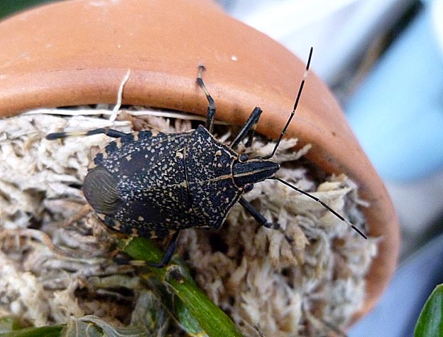 南方からやってきた帰化昆虫のようで長崎市あたりに以前はいたものが、最近どんどん分布を広げているそうです。倉敷昆虫館の標本の紹介にキマダラカメムシの説明があります。分布の拡大は地球温暖化によるものだと思います。しかし、デンドロビウムにカメムシがとまっているのは初めて見ました。