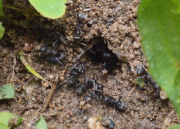 近くのクロヤマアリの巣にはたくさんのクロヤマアリが見られました。巣から土を運んでいるものも多く見られました。