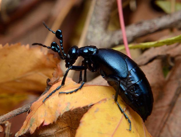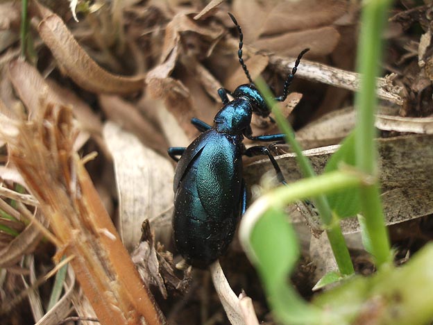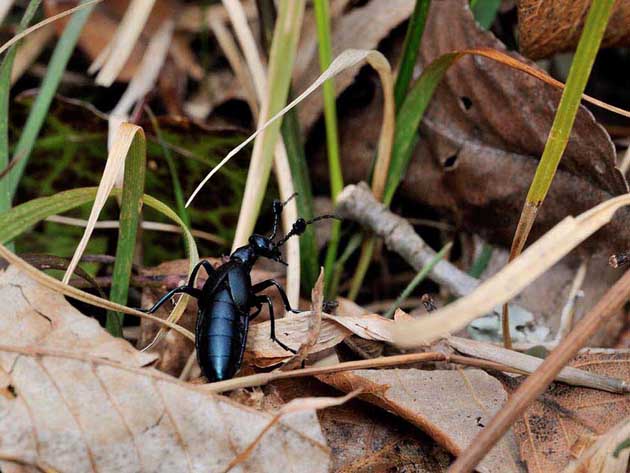 枯れ葉の上にツチハンミョウのメスがいました。しばらくすると草の中に入っていきました。よく見るとニシノホンモンジスゲの葉を食べていました。
