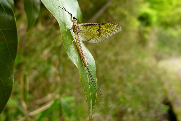 翅が不透明のカゲロウがとまっていました。やや白っぽく感じます。羽化仕立てのモンカゲロウのオスの亜成虫だろうと思いましたが、尾が2本で紋が大きくないので別の種類のような気がします。 |