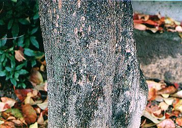 カキの幹、特に地面に近い部分や太い枝の上の面などをよく見るとつめの跡のような線が見られます。最近ついたものではなく、日数が少したっているようです。タヌキがこの木に登ってカキの実を食べていたのではないかと思われます。ちょうど近くにタヌキについて詳しい人がいましたので話を聞くと、