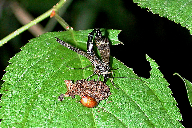 鳴く虫の調査をしていると多くのシリアゲムシを見ました。もちろんこの時期の体の色は黒ではなく、べっこう色をしています。 |