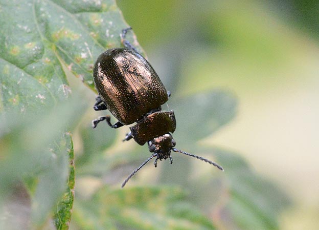 ヨモギハムシは晩秋に見られる甲虫。子どものころからそんなイメージがありました。しかし、観察していると5月にもヨモギハムシが見られます。ただし、太ってはいませんし、交尾も見ませんでした。 |