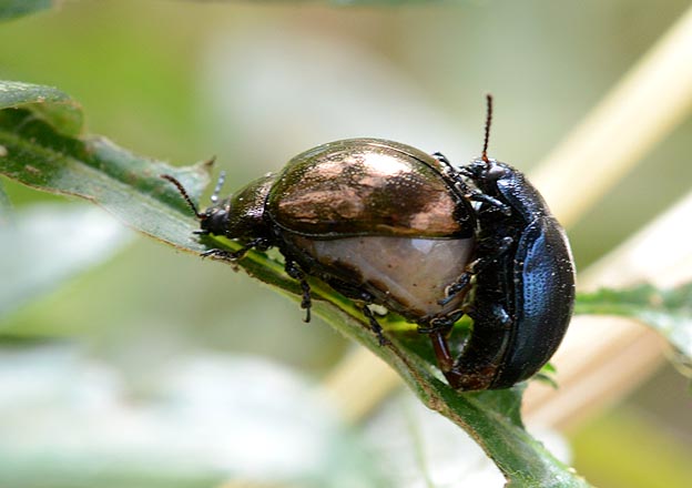 ヨモギの葉の上でヨモギハムシが交尾をしていました。メスの腹部がはちきれそうでした。 |