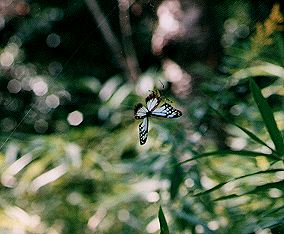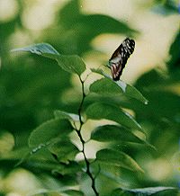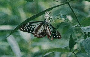 その後、市民の森に向かう林床のコースをたどりました。11時50分、1匹のアサギマダラがゆったりと飛んだり、葉に止まったりするようすを時間をかけて観察することができました。♀(メス)でした。