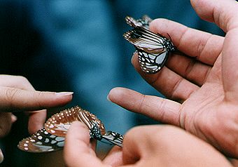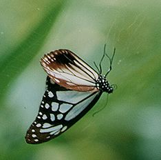 12時5分には、2匹のアサギマダラが姿を見せてくれました。15分にも2匹が…。25分に1匹、30分に2匹と次々と姿をあらわしました。市民の森に着いたのは40分になってしまいましたが、ここでは4匹を観察できました。ヒヨドリバナで吸蜜をするもの、クモの巣にひっかかっているものなど移動中の生活のようすがよく分かりました。採集をして♂(オス)と♀(メス)の確認をして放ちました。その後、48分に1匹、51分に1匹が目撃されました。