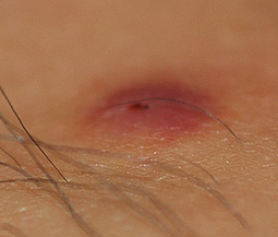 少しアップにしたのが上の写真です。「かさぶた」のようなものが立った状態はマダニにさんざん吸われたときなのです。 |