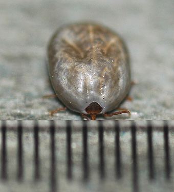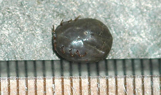 8月11日。いつも歩き回っているのに今日は全く動かない。死んでしまったようだ。もちろん私ではなく、マダニのほうです。 |
