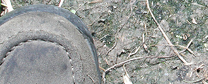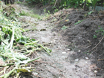 畑の中の道は農作業(のうさぎょう)をする人に踏(ふ)まれているので通るところが平らになっています。