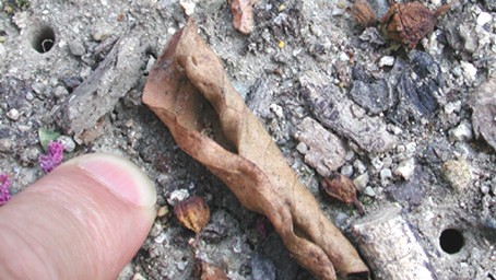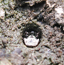 地面を探し回る私を見てカエル採りをしていた子どもたちがやって来ました。右のようなものを見せてくれました。「ガムシの子どもかな。」と思いましたが自信がありません。写真を撮らせてもらいました。道端にひとつだけあったハンミョウの穴を教えました。初めて見たそうです。