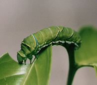 アゲハチョウの幼虫(ようちゅう)がミカンの葉(は)を食(た)べています。草(くさ)の葉にとまっていた昆虫が幼虫だと、その葉やそれについているむしなどを食べていることが多(おお)いのです。もちろん木の葉でも同じです。