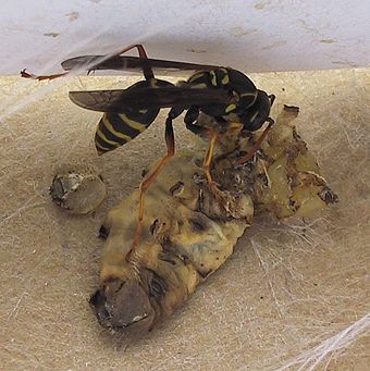 しかし、アシナガバチなどのなかまは、えさをつかまえると幼虫などを肉の団子(だんご)にします。そして、それを自分達の幼虫のえさにするのです。