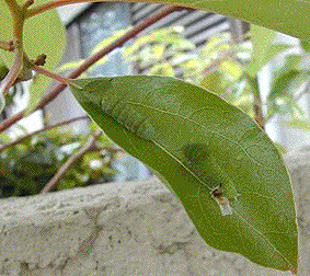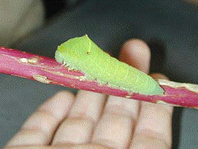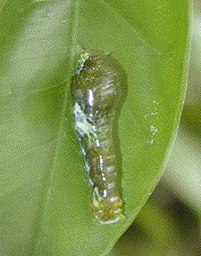 下の写真は、『ナガサキアゲハ』の幼虫です。まだ、小さいのですが、緑がかっています。