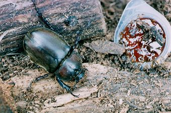 ・昆虫用ゼリーを入れますが、よく食べるので大きめのものにしましょう。木に塗(ぬ)りつけるのもいい方法(ほうほう)です。黒砂糖(くろざとう)とビールなどを使って自家製(じかせい…じぶんでつくったもの)の樹液(じゅえき)も作れます。