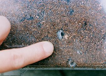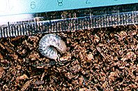 ・飼育(しいく)ケースの横から幼虫が見えます。これは、1998年7月31日のようすです。