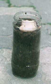 ・びんの下半分に畑などの土をかために入れます。その上に古くなったマットなどの餌(えさ)を入れておきます。幼虫は、下のかたいところで蛹室(ようしつ…蛹になる時につくる部屋)をつくり、その中で蛹になります。