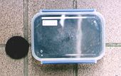 ・取り出した成虫は2~3週間は餌を食べません。また、いきなりほかの成虫の入れ物に入れていっしょにすると大きなオスでも前からいるメスに食べられてしまうことがよくあります。100円ショップなどで売(う)っている「しっかりした弁当(べんとう)のおかず入れ」などを使うと便利(べんり)です。左に写(うつ)っているのは、大きさをくらべるためのレンズのキャップです。
