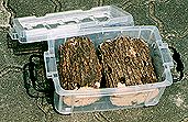 ・容器(ようき)の中に幼虫をうめこんだ木と、もう1本うめこんでいない木を入れます。オスで大きくなるものは、1本の木ではじゅうぶんではありません。その上にもマットをつめておきます。