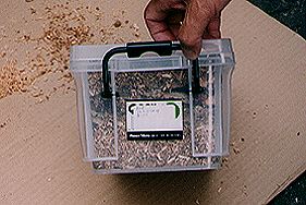 ・穴のなかに幼虫を入れます。これまで幼虫が食べていた木のくずを底(そこ)に少し入れ、幼虫を入れてからそっと先ほどの木のくずでおおっておきます。こうすると失敗(しっぱい)がほとんどありません。