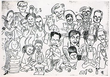 手塚治虫さんが大学生のころに描かれた「クラス会」のスケッチです。今度は、見つけられるかも知れませんね。(一般の方が見らると誤解を生じると考えられる部分は、修正させていただきました)