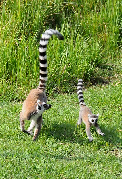 右のワオキツネザルは、生まれて1年たっていないと思います。ほかのなかまを見つけてはじゃれ付きにいきます。遊びが大好きで、ずっと動き回っています。 |