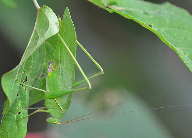 植物の葉の上にキリギリスのなかまがとまっていないかとライトで照らしているとサトクダマキモドキの幼虫がいました。産卵管があるのでメスです。
